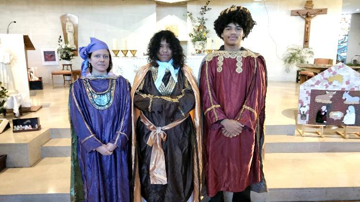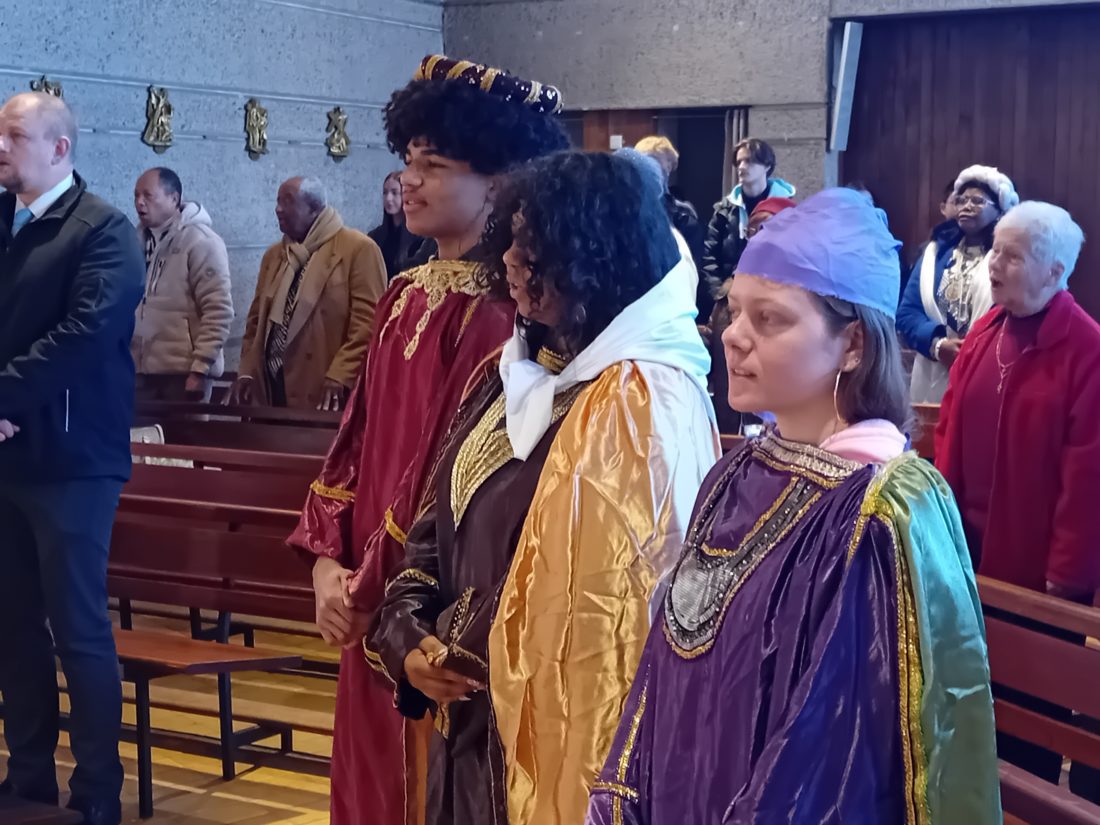 C’était le 4 janvier. Dans la procession d’entrée de la messe de 10 h 30, trois jeunes avançaient. Costumés en rois mages, ils évoquaient ces savants venus de l’Orient avec leurs présents pour honorer l’Enfant Jésus à Bethléem. Durant la messe, le père Augustin a pu aussi encenser la crèche dans l’église Saint-François-de-Sales et accueillir les offrandes apportées à l’autel par la communauté Akofala.