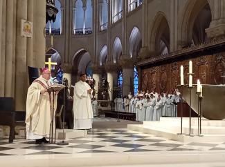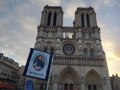Nous étions une vingtaine, notre curé en tête, à prendre le train au matin du samedi 6 décembre pour nous rendre à Paris. Pour nous distinguer, un superbe fanion paroissial était inauguré et nous le devons aux artistes associés par la Fraternité Ozanam ; un grand merci pour cette oeuvre durable et généreuse. Nous avons retrouvé plus de 1500 pèlerins du diocèse au marché aux Fleurs avant de rejoindre ensemble la cathédrale Notre-Dame.